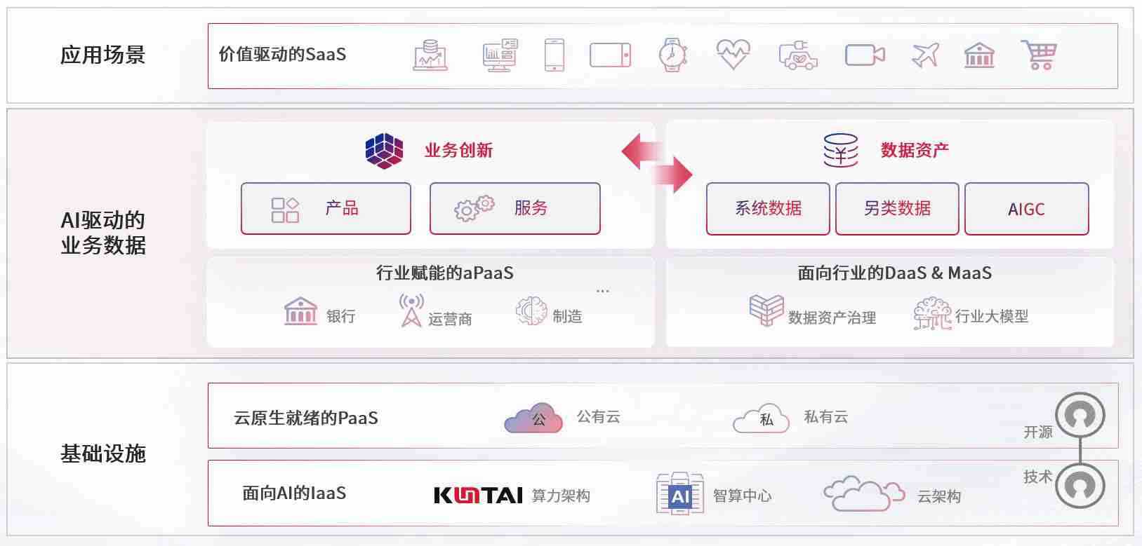 数字时代,,,,围绕企业数字化转型的关键要素,,奇亿娱乐数码开创性的提出数云融合战略和技术体系框架,,着力在云原生、、数字原生、、、、AI原生和信创产业上架构产品和服务能力,,,,为处在不同数字化转型阶段的快消零售、、、汽车、、金融、、、、医疗、、、、政企、、、、教育、、、运营商等行业客户提供泛在的敏捷IT能力和融合的数据驱动能力,,,,构建跨界融合创新的数字业务场景和新业务模式,,,,助力企业级客户建立面向未来的核心能力和竞争优势,,,全面推动社会的数字化、、、、智能化转型升级。。。