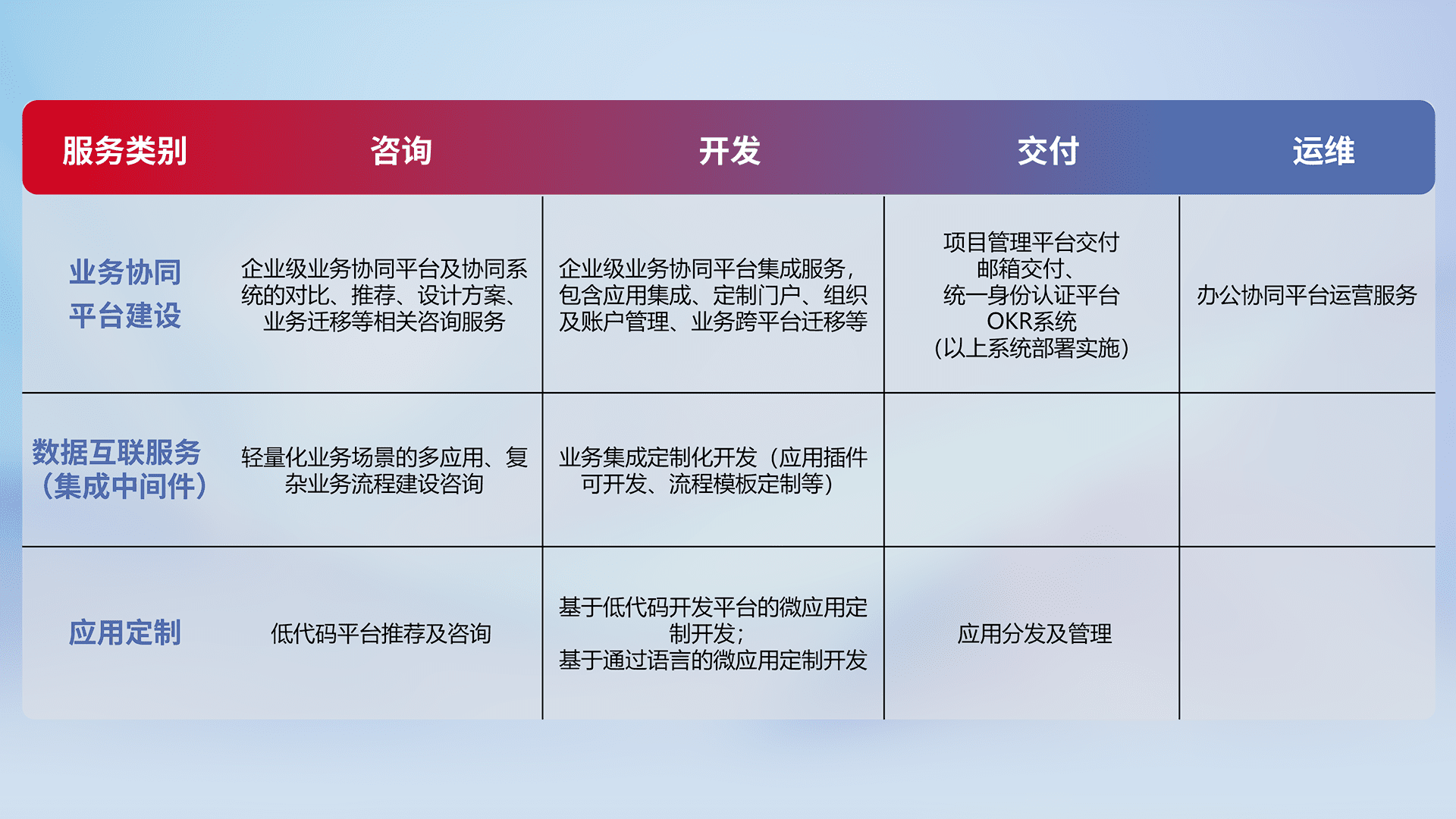 针对钉钉、、、、企微、、、IDaas等平台级产品提供产品的规划、、、方案、、交付、、、定制化开发等服务,,实现如统一协同办公、、智能客户服务、、、、混合会议管理、、、智能数据查询、、等业务场景,,,实现数字化转型。。。